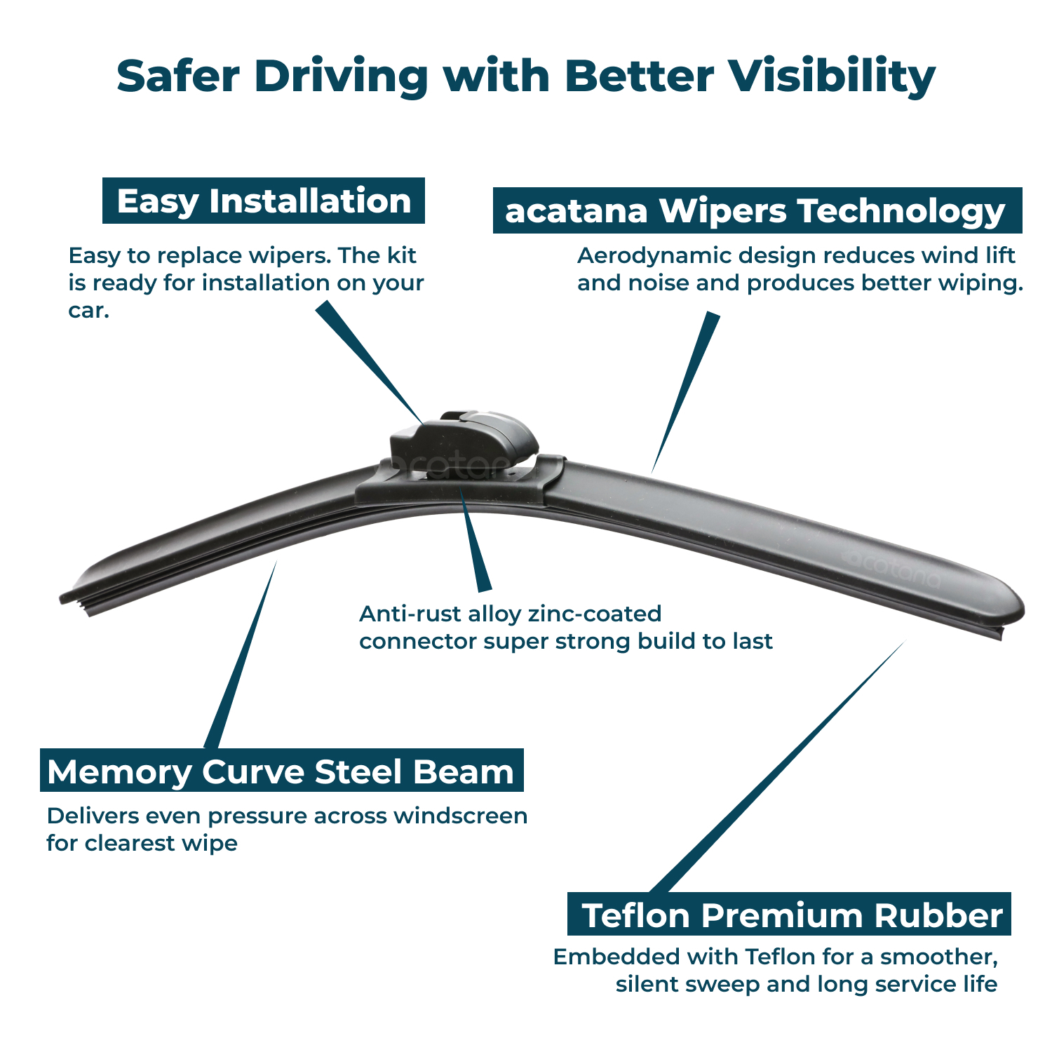 About Teflon Premium Rubber by acatana: Adding Teflon to Rubber aims to enhance wiping performance by harnessing the non-stick properties of Teflon. Our Acatana Windscreen Wiper blades, coated with Teflon, offer several benefits: