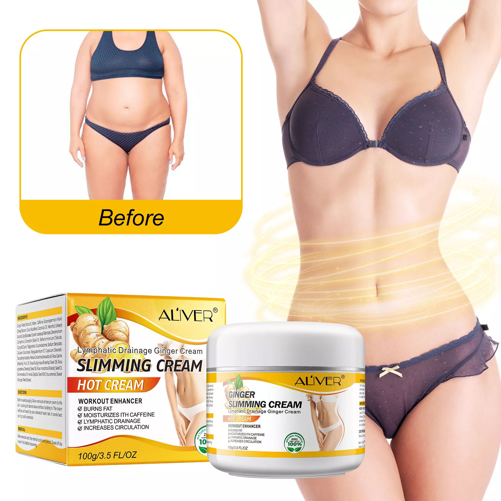 Our ginger slimming cream helps to burn fats, accelerates the metabolism and slimming, Safe without any side effects. Apply to areas with fats, cellulite and anywhere which you think needs some slimming down such as arms, waist, lower abdomen, buttocks, and thighs Effectively crushed fat stored in the abdomen; Reduce excess subcutaneous fat. Promote abdominal fat burning Easy to absorb the texture, improve body curves and help reduce fat accumulation, leaving skin firm and elastic.