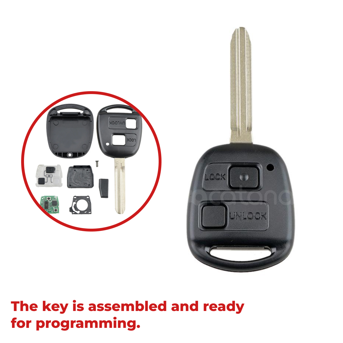 This is a complete remote car key for Toyota. A great replacement for your old, worn-out or lost car key can also be a spare key. This replacement key is assembled and ready for programming. It includes a 2-button key shell case, uncut key blade, remote transponder and 304MHz chip, battery.