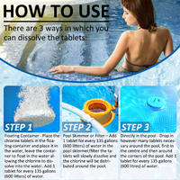 - 1. Floating Container - Place the chlorine tablets in the floating container and place it in the water, leave the container to float in the water allowing the chlorine to dissolve into the water. Add 1 tablet for every 135 gallons (600 litres) of water.
