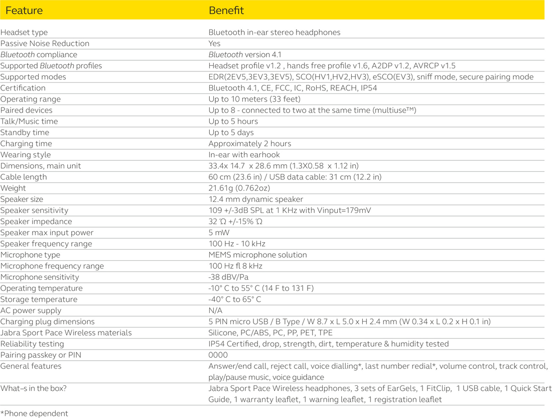 | Specification | https://www.jabra.com/~/media/Product%20Documentation/Jabra%20SPORT%20PACE/Technical%20Specifications/Jabra%20Sports_Pace_TechnSpecs_lores.ashx |