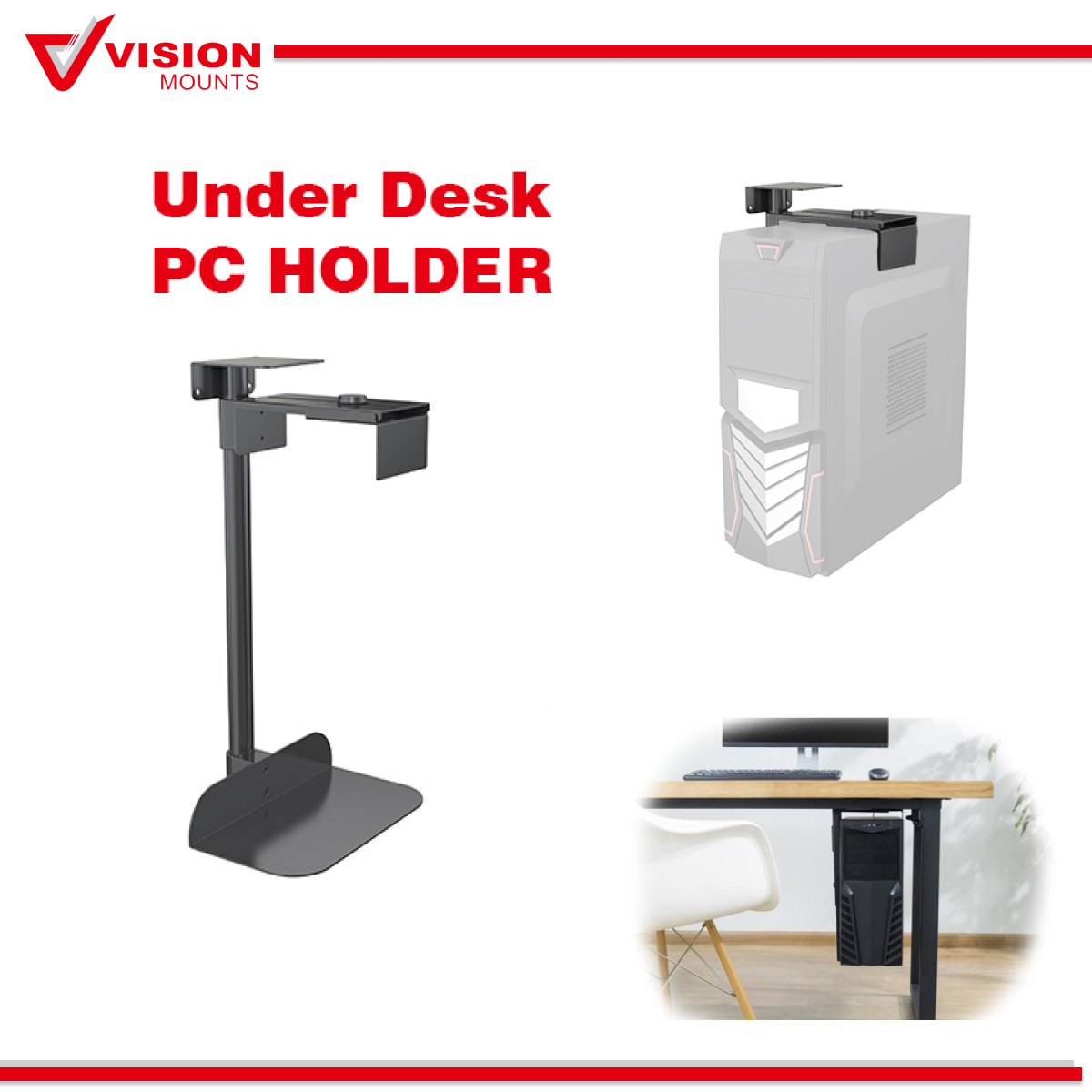 - UNDER DESK PC MOUNT This heavy-duty CPU holder conveniently mounts your PC to the underside of a desk to conserve floor space and protect your equipment from rogue dust bunnies, accumulated dirt, and the occasional coffee spill.