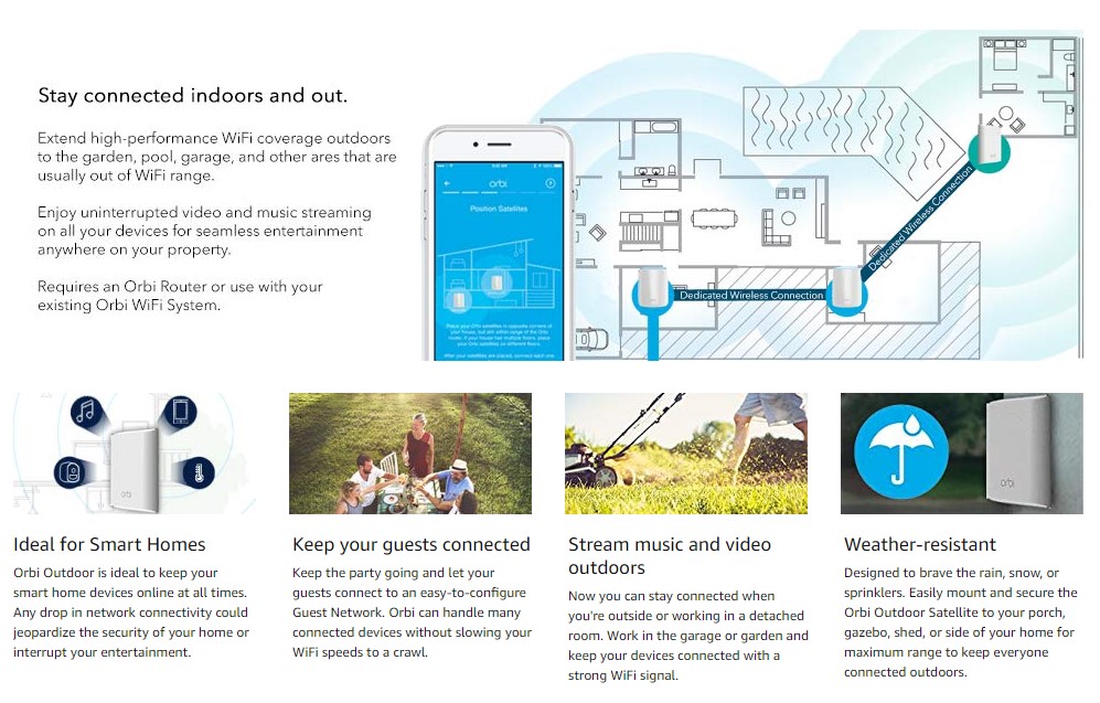 With its IP56-rated construction, the Orbi AC300 add-on satellite easily withstands various weather conditions. Provide different compatible devices optimal connectivity in the backyard just by mounting the satellite on your house’s outer wall.