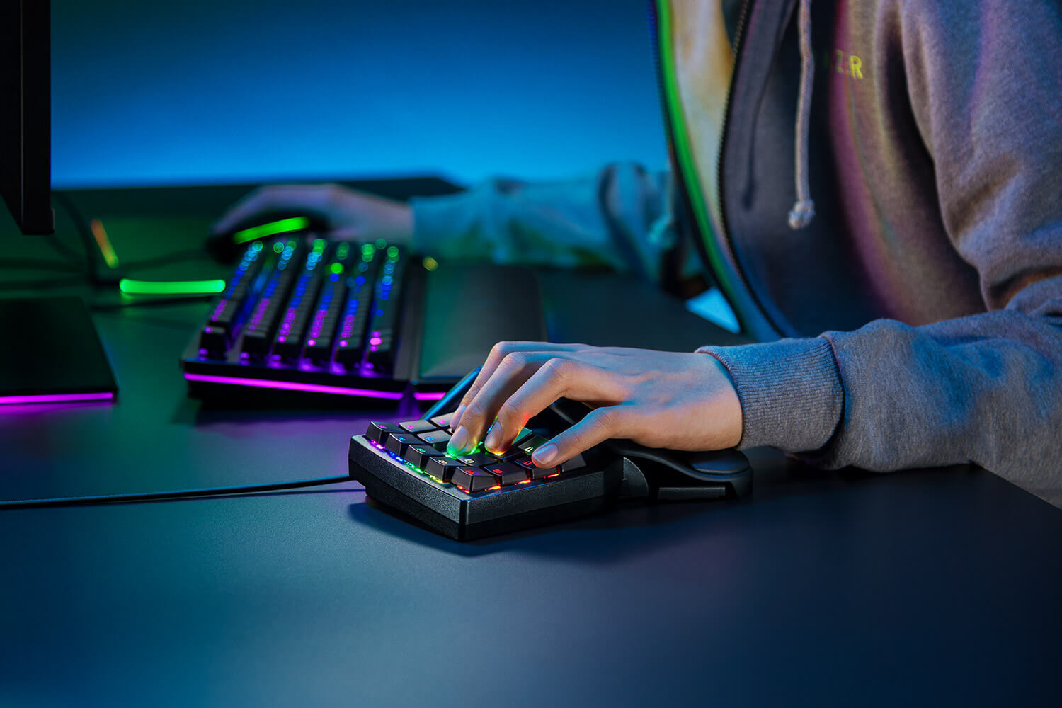 While most gaming keypads and keyboards register a singular input when pressing a key, the Razer Tartarus Pro is fitted with Razer Analog Optical Switches which can register scaling levels of input in the same motion depending on how far you press. This allows for a more measured and nuanced form of control. For example, a half press will cause your character to walk, while a full press will get them to run. This type of control is similar to how you might move your character using analog thumbsticks on a controller.