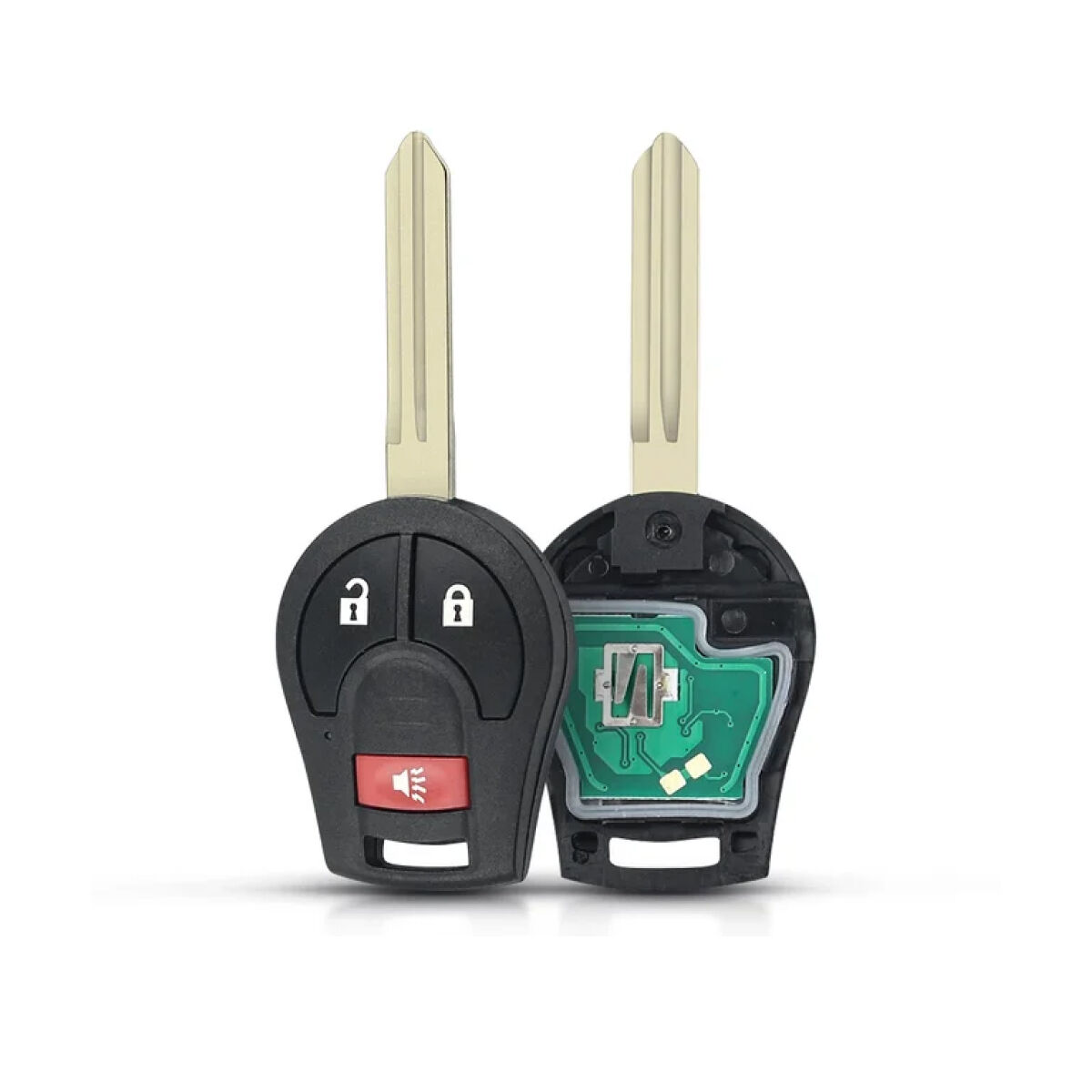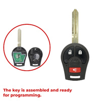 This is a complete remote car key for Nissan. A great replacement for your old, worn-out or lost car key can also be a spare key. This replacement key is assembled and ready for programming. It includes a 3-button key shell case, uncut key blade, transponder chip, 433MHz remote control and battery.
