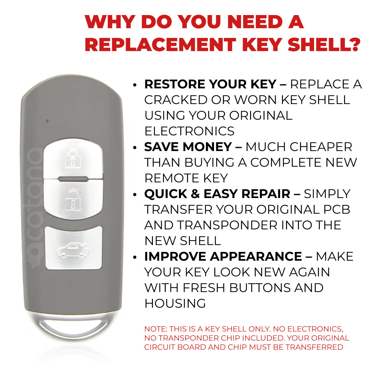 This Remote Key Shell Case is a perfect replacement for your Mazda key fob. If your old car key shell is broken, cracked, or worn out, this high-quality replacement shell will make it look and feel like new again. This replacement key fob flip shell includes only the outer case and uncut key blade. It’s easy to install - simply transfer the internal electronics (transponder chip and remote board) from your original key.