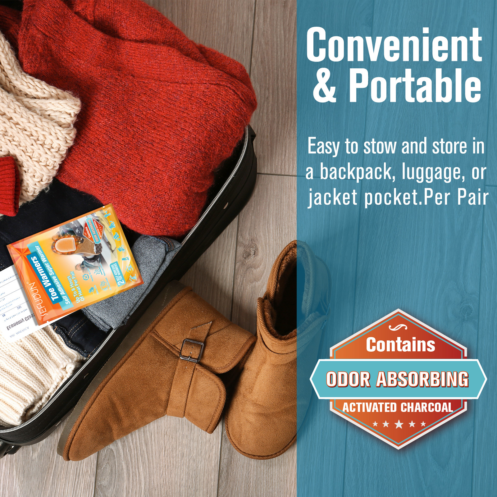 CONVENIENT TO USE - Remove toe warmer from outer package, fully air activated, tear the adhesive paper, stick it in your gloves, boots, pants, coats or mitts indoor or outdoor. Warmer heats up in few minutes. If heat decreases, expose warmer to air and shake.