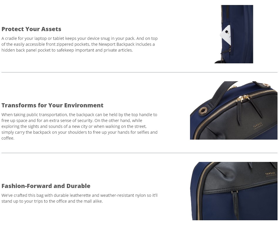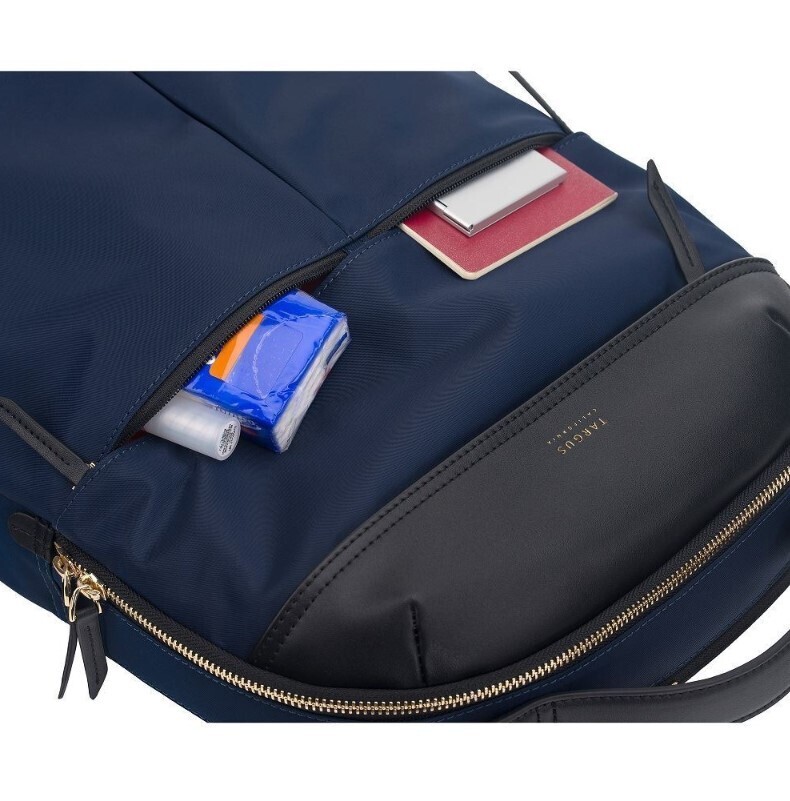 Whether you're looking for a traveling or work companion, the Targus Newport Backpack fits the bill. It wouldn’t be out of place strolling down brownstone-lined streets or beach neighborhoods, and doubles as a small backpack for your work accessories. Designed to fit slim laptops such as a 15" MacBook Pro® or tablets like a 12.9" iPad Pro® with ample space for clothing, the backpack also contains dedicate slim storage for travel essentials and everyday accessories. High-density water-repellent twill nylon and leatherette accents have been woven together to form a highly durable layer that helps protect it all with a luxurious sheen.