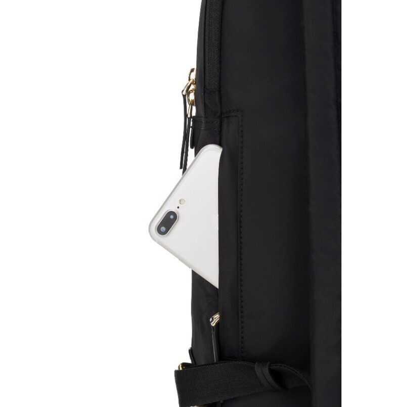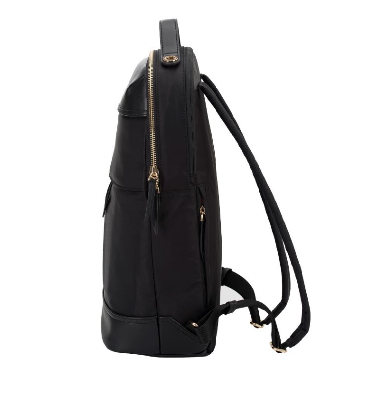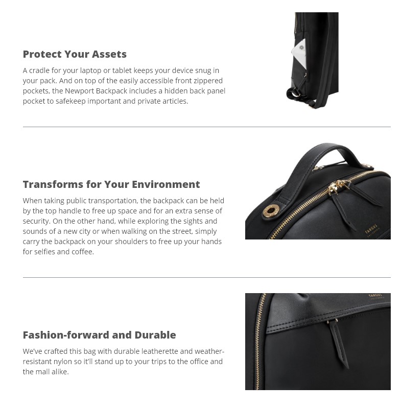 Whether you're looking for a traveling or work companion, the Targus Newport Backpack fits the bill. It wouldn’t be out of place strolling down brownstone-lined streets or beach neighborhoods, and doubles as a small backpack for your work accessories. Designed to fit slim laptops such as a 15" MacBook Pro® or tablets like a 12.9" iPad Pro® with ample space for clothing, the backpack also contains dedicate slim storage for travel essentials and everyday accessories. High-density water-repellent twill nylon and leatherette accents have been woven together to form a highly durable layer that helps protect it all with a luxurious sheen.