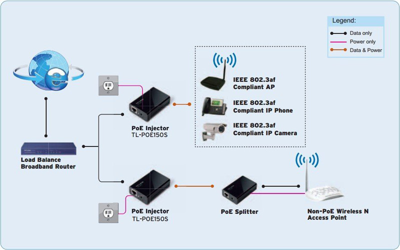 The PoE Injector TL-POE150S fully complies with IEEE 802.3af standard, and can work with all IEEE 802.3af compliant PDs (Powered Devices) and PoE Splitter such as TP-LINK’s TL-POE10R, to expand your network to where you wish to place PDs but has no power outlet. PDs include but are not limited to Access Point, IP Camera, VoIP Phones.