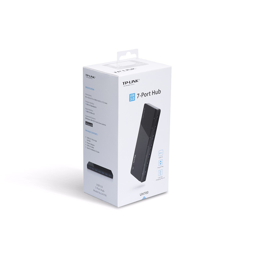 TP-Link UH700 USB 3.0 7-Port Hub, desktop with external power adapter, black
