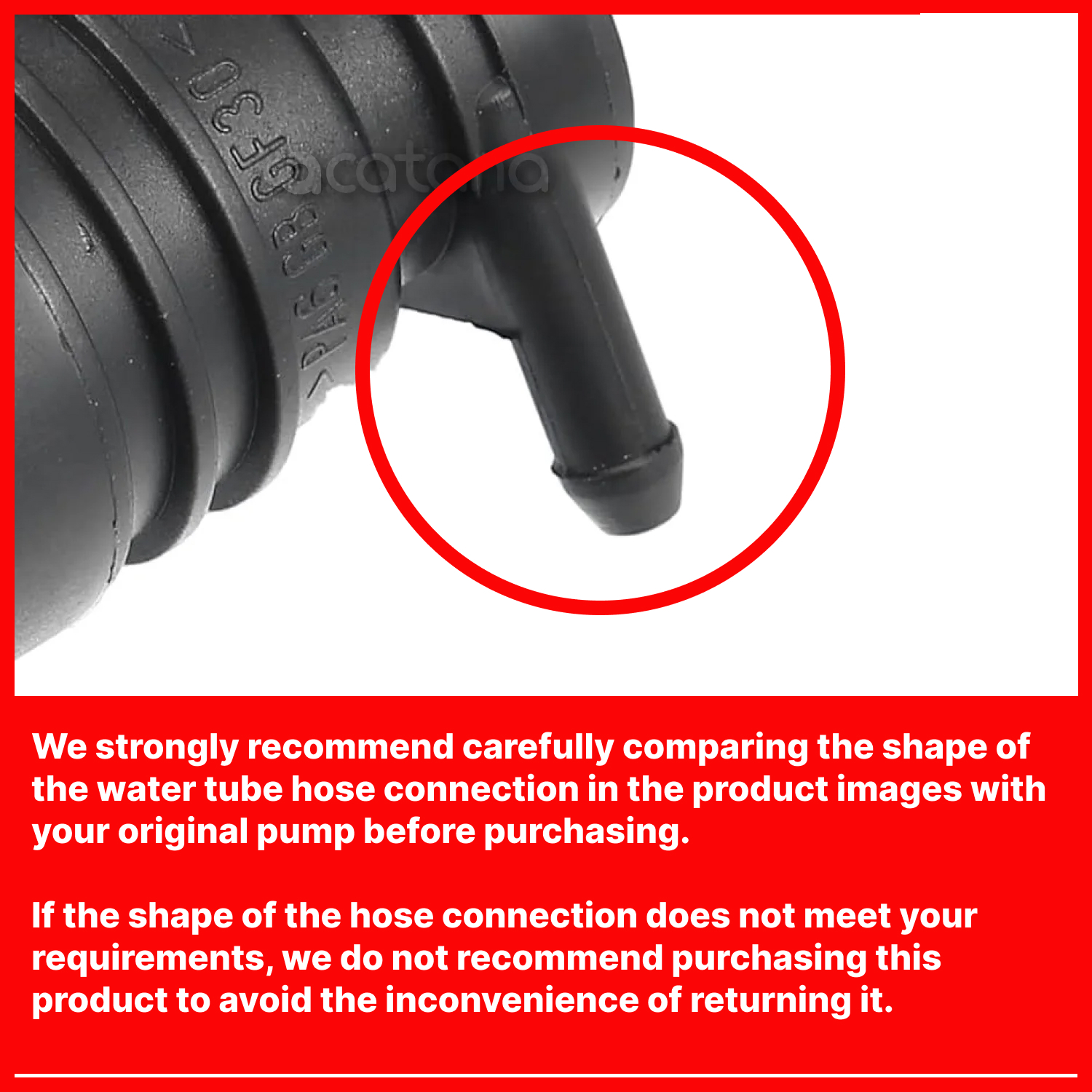- We strongly recommend carefully comparing the shape of the water tube hose connection in the product images with your original pump before purchasing.